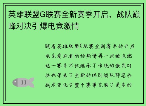 英雄联盟G联赛全新赛季开启,战队巅峰对决引爆电竞激情