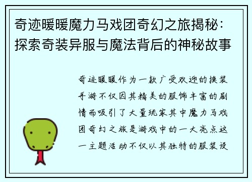 奇迹暖暖魔力马戏团奇幻之旅揭秘:探索奇装异服与魔法背后的神秘故事